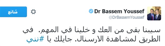 وكان باسم يوسف قد نشر عبر صفحته الشخصية على موقع التواصل الاجتماعي "تويتر"، قائلًا: "سيبنا بقى من العك وخلينا في المهم.. في الطريق لمشاهدة الأرسنال.. جايلك يا نني".