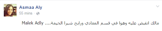 قالت أسماء علي، زوجة المحامي مالك عدلي، عبر صفحتها الشخصية على موقع التواصل الاجتماعي "فيس بوك"، إنه تم إلقاء القبض على زوجها، موضحة أنه متواجد في قسم المعادي، وفي اتجاهه للذهاب لقسم شبرا الخيمة.