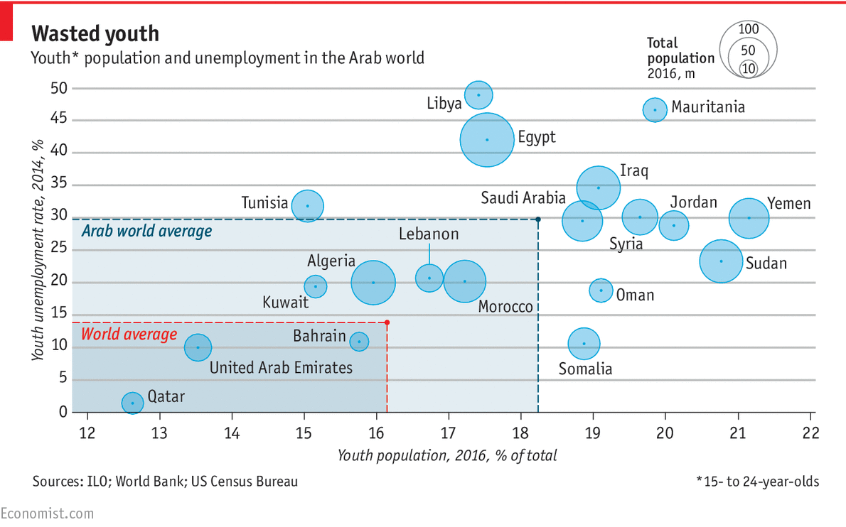 نشرت مجلة ذا إيكونوميست انفوجراف (رسما توضيحيا) حول بطالة الشباب في العالم العربي بالنسب المئوية والأرقام، وفقًا لتقارير صادرة عن منظمة العمل الدولية والبنك الدولي ومكتب تعداد الولايات المتحدة.