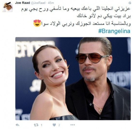 وقال "جو" عبر حسابه الرسمي على موقع التدوين العالمي "تويتر": "عزيزتي أنجلينا