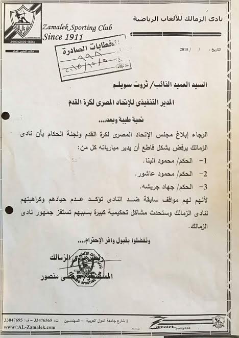 أكد مرتضى منصور رئيس مجلس إدارة نادي الزمالك فى اجتماعه بمجلس إدارة النادى على أنه منذ شهر 12/2015 تم تقديم طلب لاتحاد الكرة المصرى باستبعاد جهاد جريشة من تحكيم مباريات الزمالك.