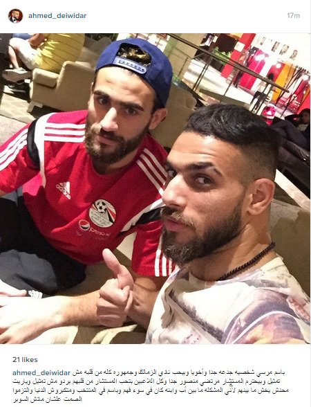 جاء ذلك فى تغريدة من اللاعب عبر حسابه الشخصى على موقع التواصل الاجتماعى انستجرام، قال فيها : " باسم مرسى شخصية جدعة جدًا وأخويا وبيحب نادى الزمالك وجمهوره كله من