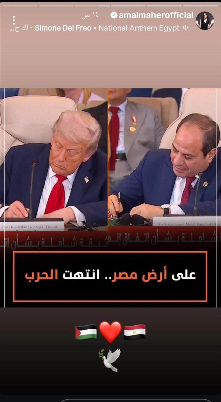 وأرفقت آمال ماهر مع الاستوري صورة جمعت الرئيس المصري عبد الفتاح السيسي والرئيس الأمريكي دونالد ترامب أثناء توقيع الاتفاقية، في إشارة إلى الجهود الدبلوماسية المبذولة لتهدئة الأوضاع وحقن دماء الأبرياء في القطاع.