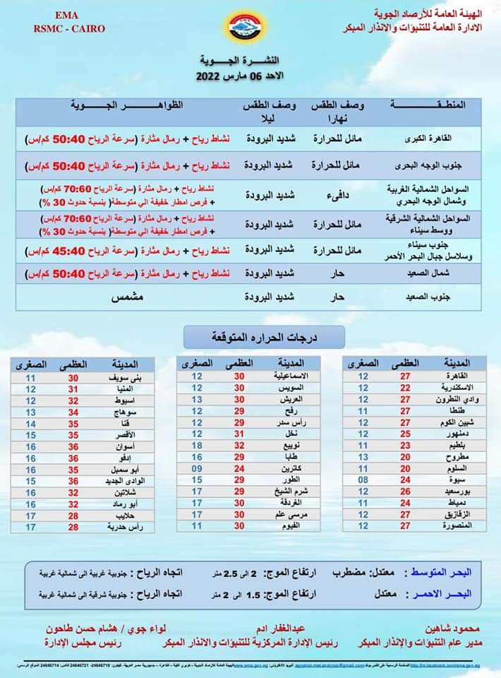 وأكدت الأرصاد الجوية، على وجود نشاط للرياح والرمال على أنحاء البلاد، مع وجود فرص لسقوط الأمطار على السواحل الشمالية الغربية وشمال الوجه البحري، والسواحل الشمالية الشرقية ووسط سيناء.