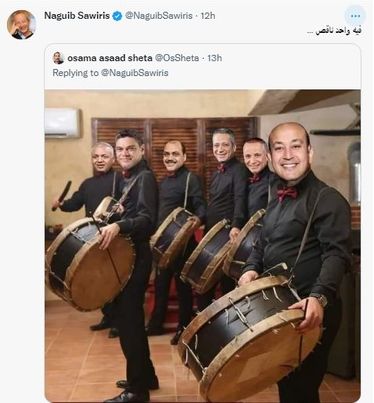 ونشر ساويرس صورة "معدلة" من حساب مغرد مجهول تجمع 6 إعلاميين، على رأسهم عمرو أديب، يحملون "طبلة"، ليقوم نجيب ساويرس بتغريدها مرة أخرى على حسابه، كاتبًا عليها: "فيه واحد ناقص".