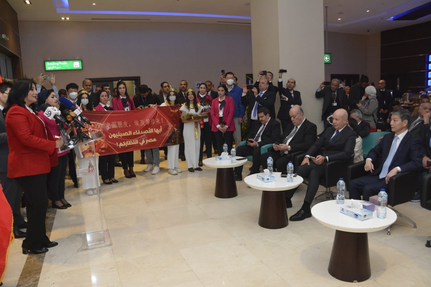 وحضر المؤتمر الأستاذة نسرين عثمانلي مدير مكاتب الهيئة المصرية العامة للتنشيط السياحي بمطار القاهرة الدولي، والمحاسب مجدى إسحق رئيس مجلس إدارة شركة ميناء القاهرة الجوى، ولفيف من قيادات السياحة والآثار والطيران المدنى والسفارة الصينية بالقاهرة ولفيف من حزب حماة وطن وقيادات المطار وأعضاء السفارة الصينية فى مصر، حيث تم استقبال الوفد السياحى الصينى بالورود والشوكولاتة وفرقة فولكلور شعبية وهدايا تذكارية من جانب فرق العلاقات العامة بشركة ميناء القاهرة الجوى ومكتب الهيئة المصرية العامة للتنشيط السياحى بمطار القاهرة الدولي.