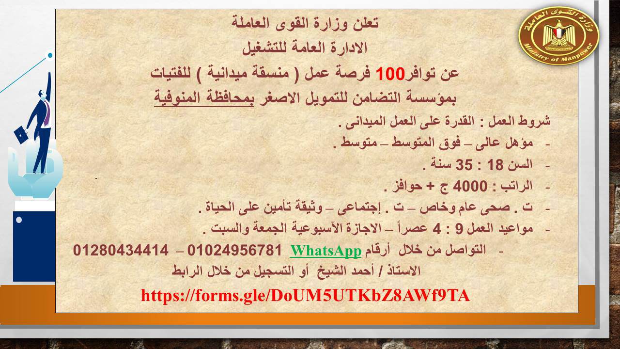 وأضافت المدير العام، أنه تم توفير 100 فرصة عمل للعمل فى وظيفة (منسقة ميدانية) للفتيات بمؤسسة التضامن للتمويل الأصغر بمحافظة المنوفية، من حملة المؤهللات العليا والمتوسطة وفوق المتوسطة من سن 18 إلى 35 سنة براتب يبدأ من 4000 جنيه بالإضافة إلى الحوافز والتأمين الصحى والاجتماعى ووثيقة تأمين على الحياة، ومواعيد العمل من الساعة التاسعة صباحًا حتى الرابعة عصرًا والإجازة الأسبوعية يومى الجمعة والسبت، ويمكن الاستفسار والتقديم من خلال التواصل على  أرقام 01024956781  –  01280434414، كما يمكن التقديم من خلال فروع المؤسسة بالمحافظات كما هو موضح فى الإعلان المرفق.