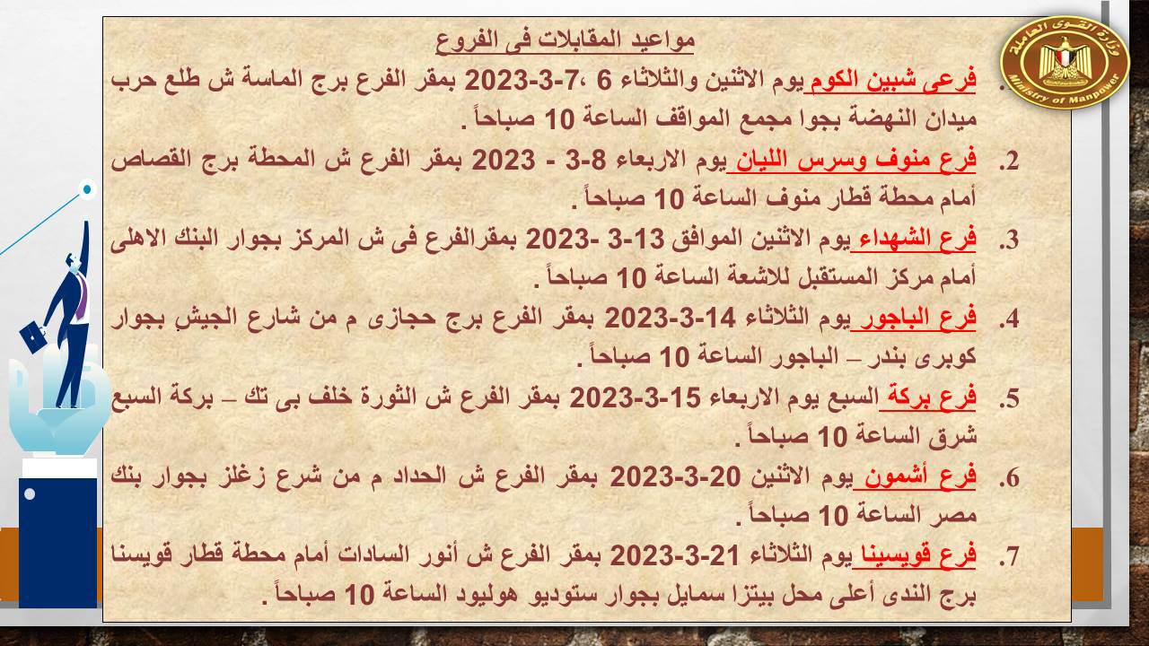 القوى العاملة تعلن عن 190 فرصة عمل بالقاهرة والمنوفية