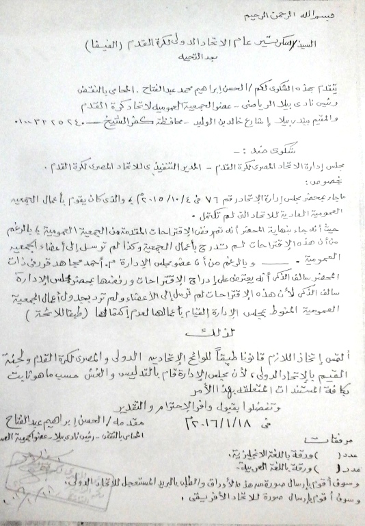 تقدم حسن عبدالفتاح رئيس نادي بيلا، بشكوى ضد اتحاد الكرة، لدى الاتحاد الدولي لكرة القدم "الفيفا"، بسبب الجمعية العمومية بلاية في إبريل المقبل.
