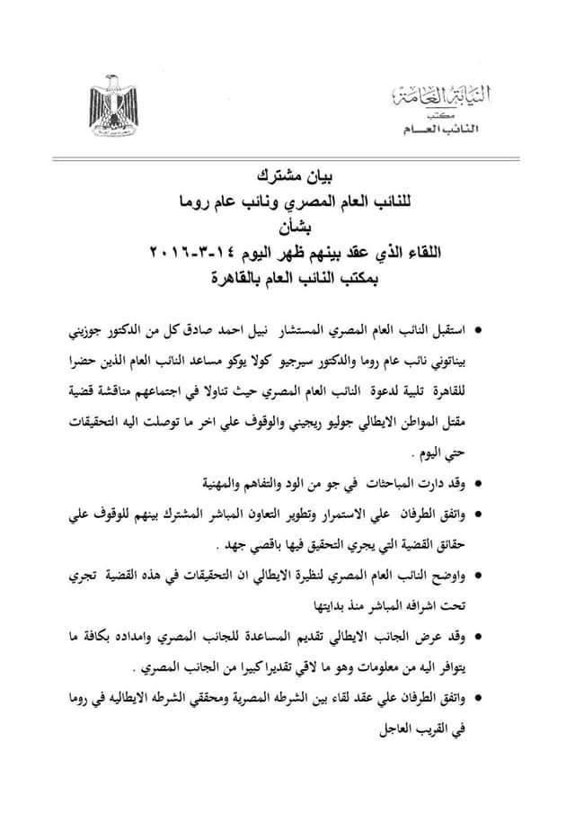 بيان مشترك بين النائب العام المصري ومدعي روما بشأن «ريجيني»