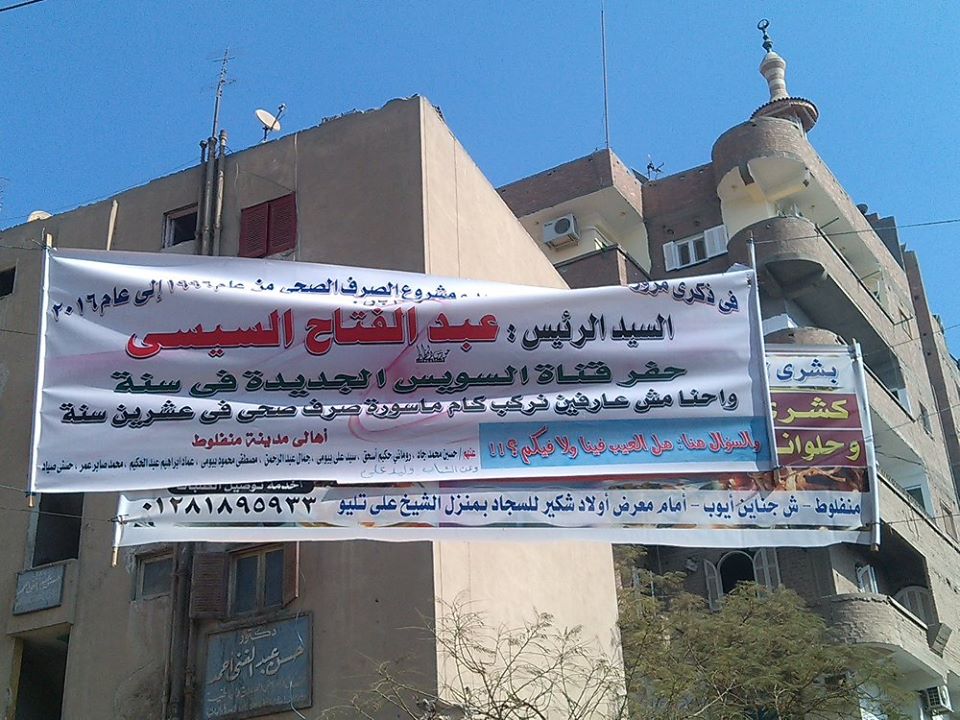 وعلق عدد من شباب منفلوط لافتة مكتوب عليها "في ذكرى مرور 20 عاما على بدء مشروع الصرف الصحي من عام 1996 إلى عام