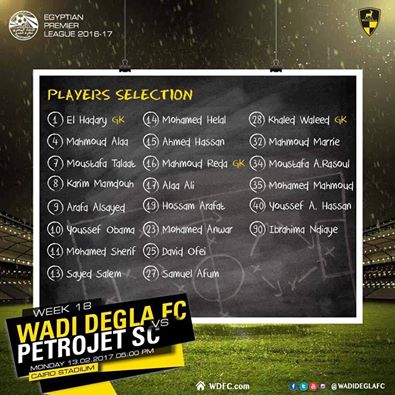 أعلن الجهاز الفنى لفريق الكرة بنادى وادى دجلة بقيادة  أحمد حسام "ميدو" المدير الفني نعن قائمة فريقه لمواجهة بتروجت في بداية الدور الثاني من الدوري المصري، وجاءت القائمة على النحو التالي: