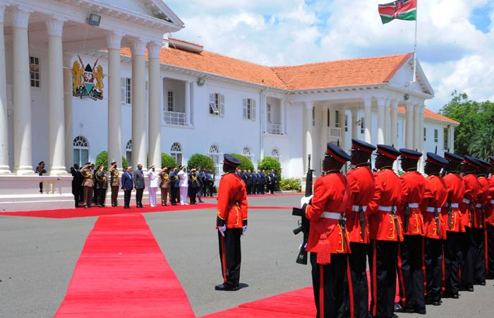حيث كان في استقبال سيادته الرئيس الكيني أوهورو كينياتا، وأقيمت مراسم الاستقبال الرسمي، واستعراض حرس الشرف وعزف السلامين الوطنيين.