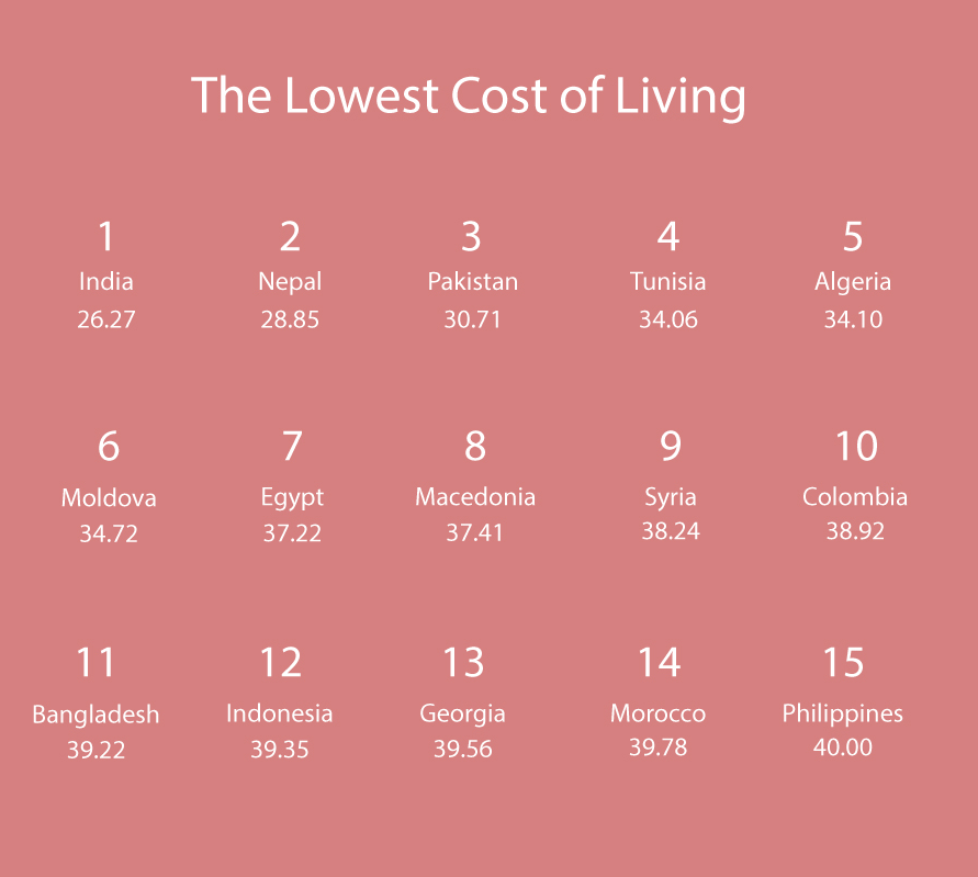 حيث أوضحت صحيفه "الإندبندنت" البريطانية أن أرخص خمس دول من حيث الظروف المعيشية وفقا لبيانات "مؤشر أسعار المستهلكين "هي الدول الآسيوية و دول شمال أفريقيا وتتضمن: الهند و نيبال و باكستان وتونس و الجزائر.