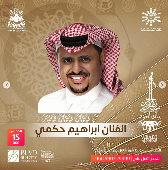 يستعد الفنان السعودي إبراهيم حكمي، لإحياء حفل غنائي في المملكة العربية السعودية، وذلك ضمن فعاليات موسم الرياض 2022، فوق الخيال برعاية الهيئة العامة للترفيه، الذي يضم عددًا كبيرًا من نجوم الغناء العربي والخليجي.