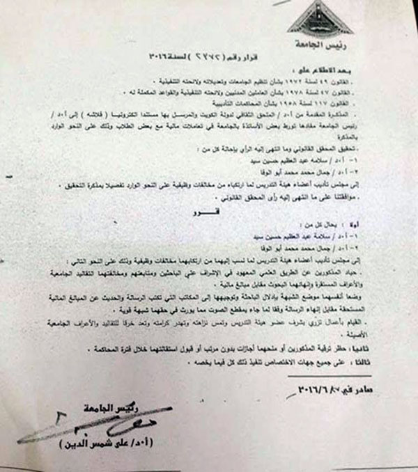 كما قرر رئيس الجامعة بحظر ترقية الأساتذة المذكورين أو منحهما أي إجازات دون مرتب أو قبول استقالتهما حتى انتهاء التحقيقات معهما في الوقائع المنسوبة إليهما