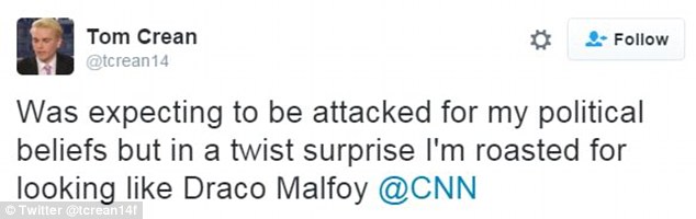 وجاء رد فعل "توم" عبر تدوينة على صفحته على موقع "تويتر" جاء فيها: كنت اعتقد أنكم ستهاجمونى لموقفى السياسى وليس لمظهري الشبيه بشخصية "دلااكو مالفوى" وأضاف ساخراً سنهزم "هافلباف" اليوم" فى إشارة منه للمرشحة "هيلارى كلينتون".