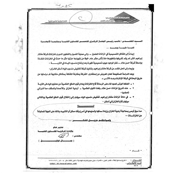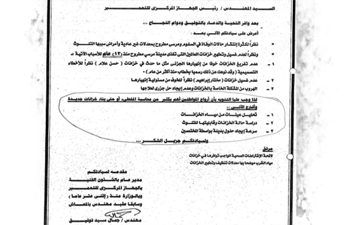 أشار طلب الإحاطة والمستندات التى حصلت عليها «الوفد» إلى وجود أخطاء تصميمية فى 4 خزانات تنفيذ إحدى شركات قطاع الأعمال العام التى لم يتم عملية الغسيل والتطهير الدورى لهم أو تفريغهم منذ 12 عاماً تخوفاً من انهيارهم جزئياً مثلما حدث فى 4 خزانات مماثلة نفذتها شركة عامة أخرى نتيجة وجود عيوب تصميمية ظهرت بعد ارتفاع منسوب المياه فى التربة.
