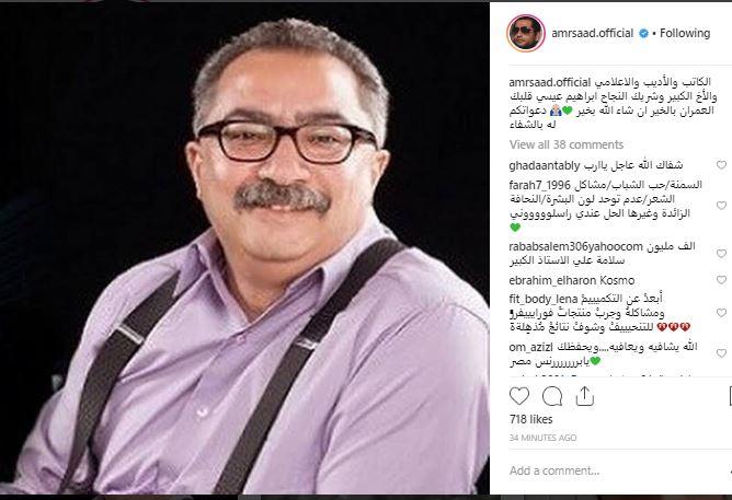 طلب الفنان عمرو سعد، عبر حسابه الشخصي بموقع تبادل الصور والفيديوهات"إنستجرام"، من جمهوره الدعاء بالشفاء لإبراهيم عيسى.