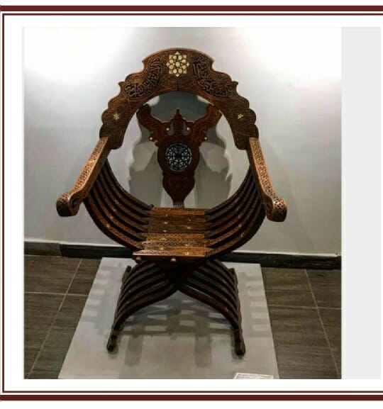 كرسى "هدى شعراوى".. هو كرسى فوتيه من الخشب المطعم بالصدف والمسامير الحديدية، ارتفاعه 108 سم.