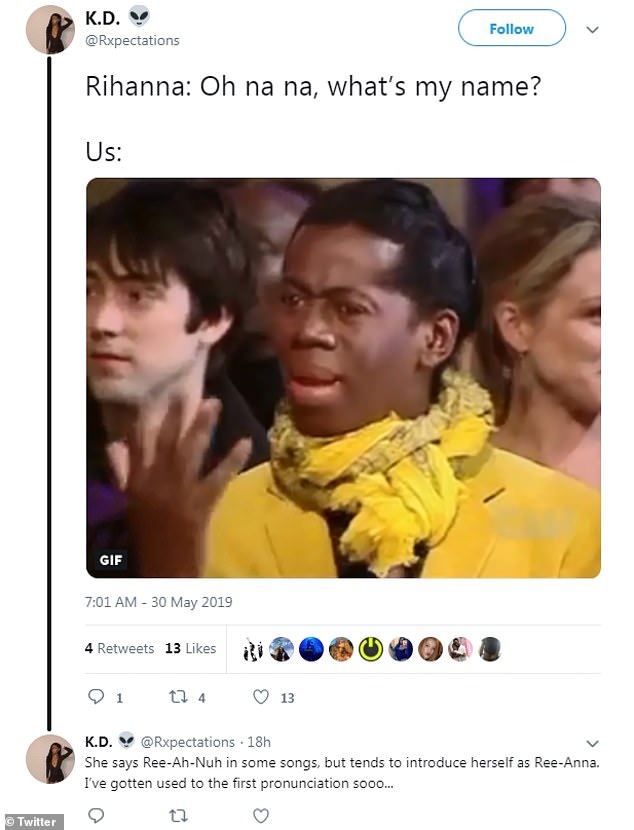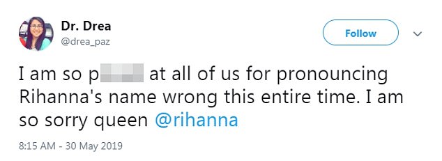 وقالت ريهانا إن اسمها "Ree-Anna" بدلاً من "Ree-Ah-Na" ، والتي هي في معظمها عبارة عن النطق الأمريكي.