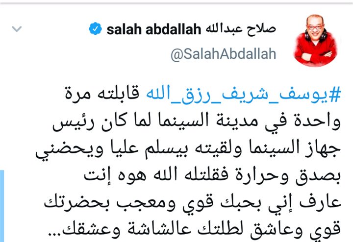 كتب عبد الله عبر حسابه الرسمي على موقع "تويتر" "#يوسف_شريف_رزق_الله قابلته مرة واحدة في مدينة السينما لما كان رئيس جهاز السينما ولقيته بيسلم عليا ويحضني بصدق وحرارة فقلتله الله هوه إنت عارف إني بحبك قوي ومعجب
