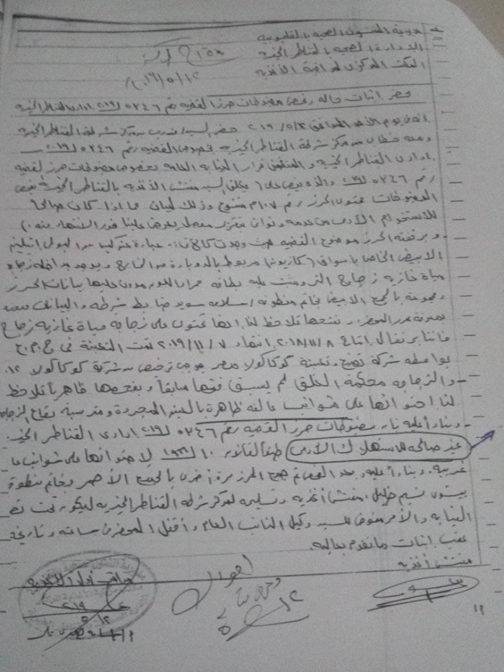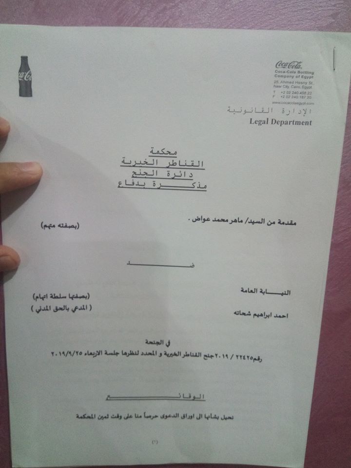 كان أحمد خضر المحامي، تقدم ببلاغ ضد شركة كوكاكولا، والمدير المسئول عن إدارة شركة كوكاكولا للمياه الغازية، إلى قسم شرطة القناطر الخيرية.