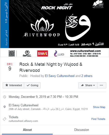 ويبدأ حفل روك أند ميتال نايت، في تمام الساعة السابعة مساًء، وذلك يوم الأثنين الموافق 9 من شهر ديسمبر المقبل، على مسرح قاعة النهر، بساقية الصاوي، الزمالك، بسعر التذكرة 62 جنيهًا.