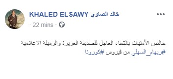 ووجه خالد الصاوي رسالة إلى ريهام سهلي، متمنيًا لها الشفاء العاجل بعد إصابتها بفيروس كورونا المستجد، قائلًا: خالص الأمنيات بالشفاء العاجل للصديقة العزيزة والزميلة الاعلامية ريهام السهلي من ڤيروس كورونا.