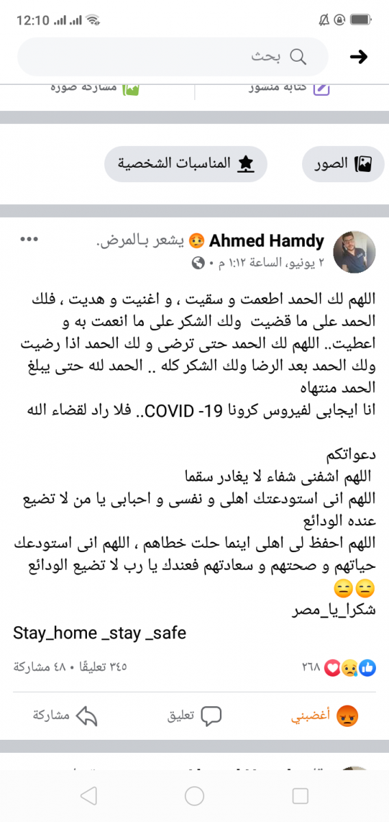 أعلن الدكتور أحمد حمدي، أحد أطباء النساء والتوليد بمستشفي أسوان الجامعي، عبر صفحته الرسمية بموقع التواصل الاجتماعي "فيسبوك"، أنه إصابة بفيروس كورونا المستجد كوفيد 19، عقب أداء عمله، موضحاً أن الجميع سوف يصاب ولا أحد يتنمر عن الاخرون لنه مرض طبيعي مثل الأمراض الأخري.