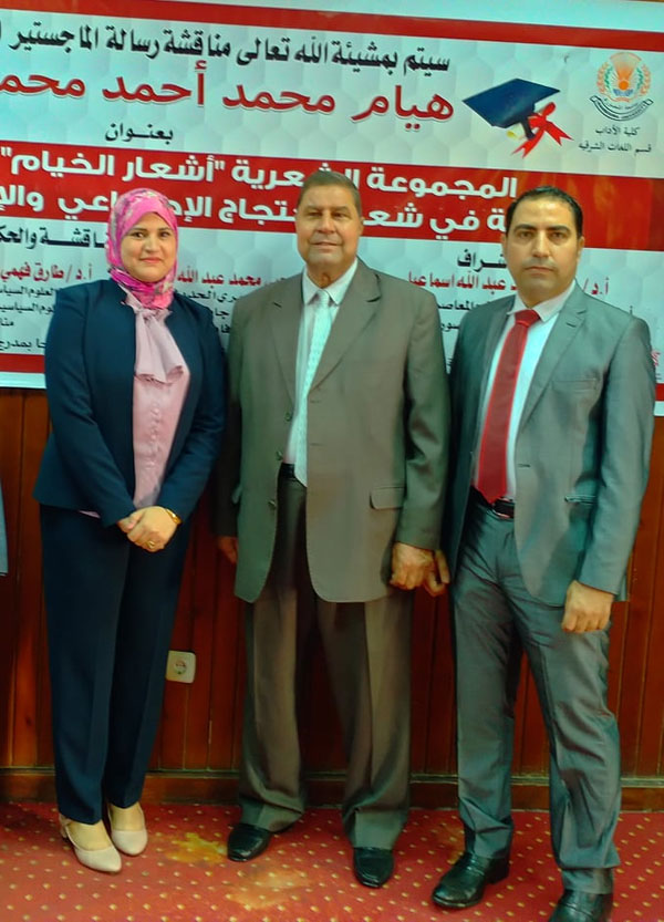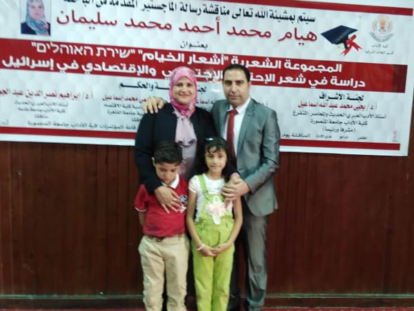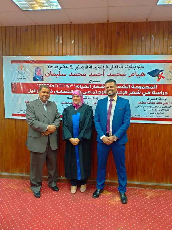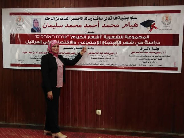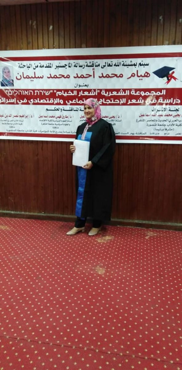 حصلت الزميلة هيام سليمان الصحفية بجريدة الوفد على درجة الماجستير في الأداب بتقدير امتياز .. تخصص أدب عبري حديث عن شعر الاحتجاج الاجتماعي والاقتصادي في اسرائيل .
