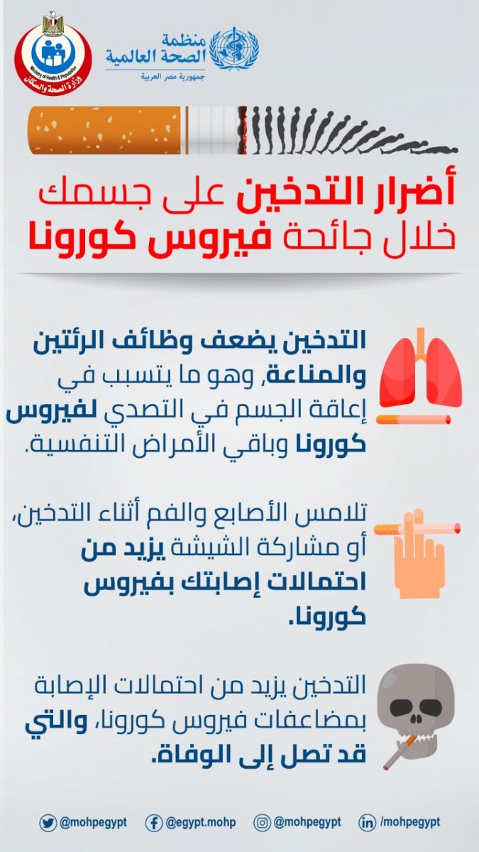 لذا وفي هذا الصدد، نشرت وزارة الصحة المصرية عبر صفحتها الرسمية على موقع التواصل الإجتماعي الأشهر فيسبوك أضرار التدخين على صحتك وخاصةً خلال جائحة فيروس كورونا المستجد "كوفي-19"، والتي جاءت على النحو التالي:-