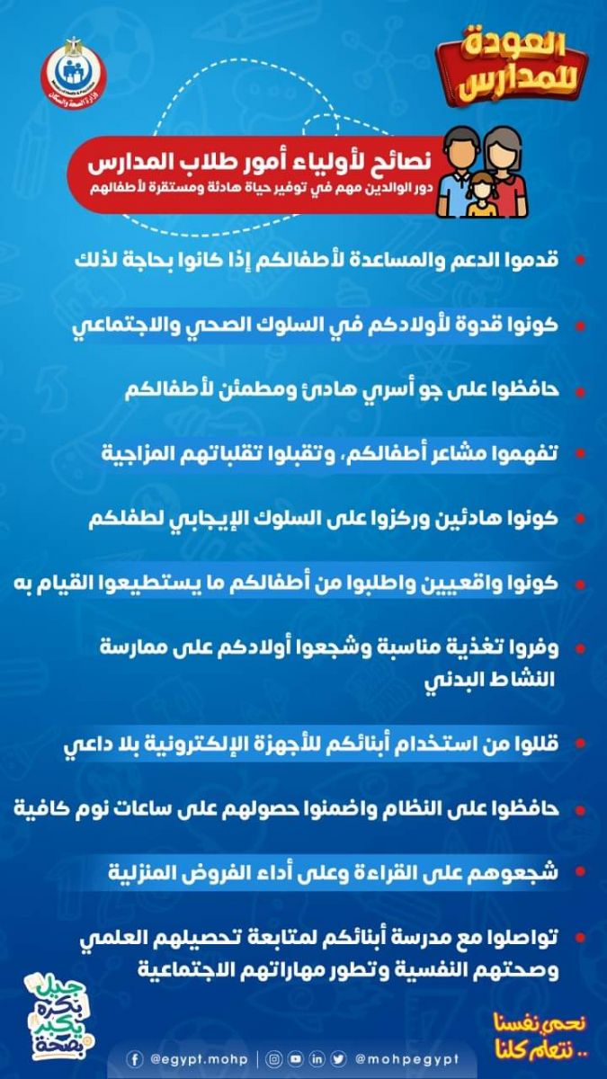 ونشرت وزارة الصحة والسكان عبر صفحتها الرسمية على موقع التواصل الاجتماعي "فيس بوك" إنفوجراف يقدم نصائح للتعامل بطريقة صحيحة مع الأطفال خلال فترة الدراسة: