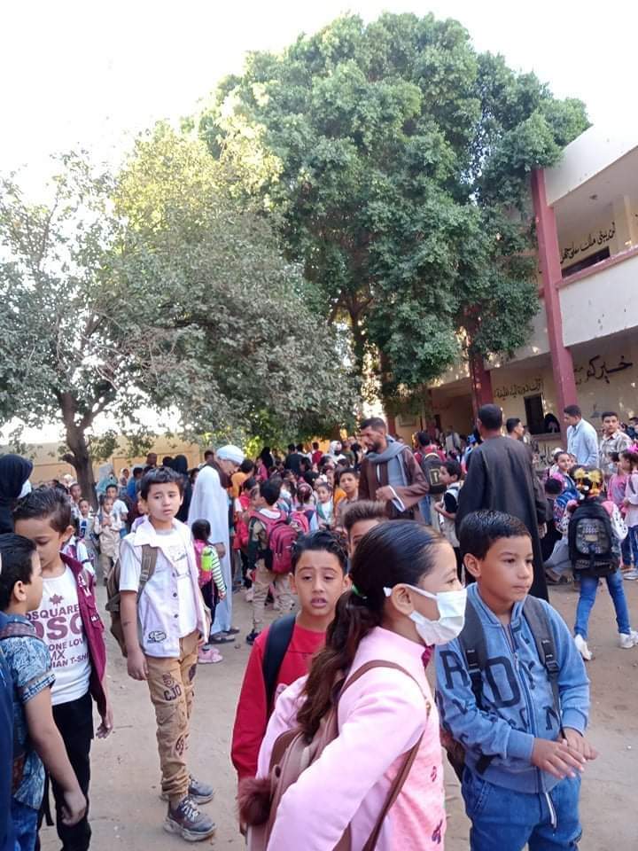 وتوافد الطلاب والتلاميذ على المدارس فى أول يوم للعام الدراسى الجديد وتزينت المدارس لاسنقبالهم مع الحرص على تطبيق الإجراءات الاحترازية من تباعد وارتداء كمامة وقياس درجة حرارة الطلاب لحظة الدخول من بوابة المدرس واصطف التلاميذ في طابور الصباح للاستماع الى التعليمات وبعد تحية العلم اصطحب كل معلم تلاميذ فصله والصعود بهم إلى حجرة الدراسة.