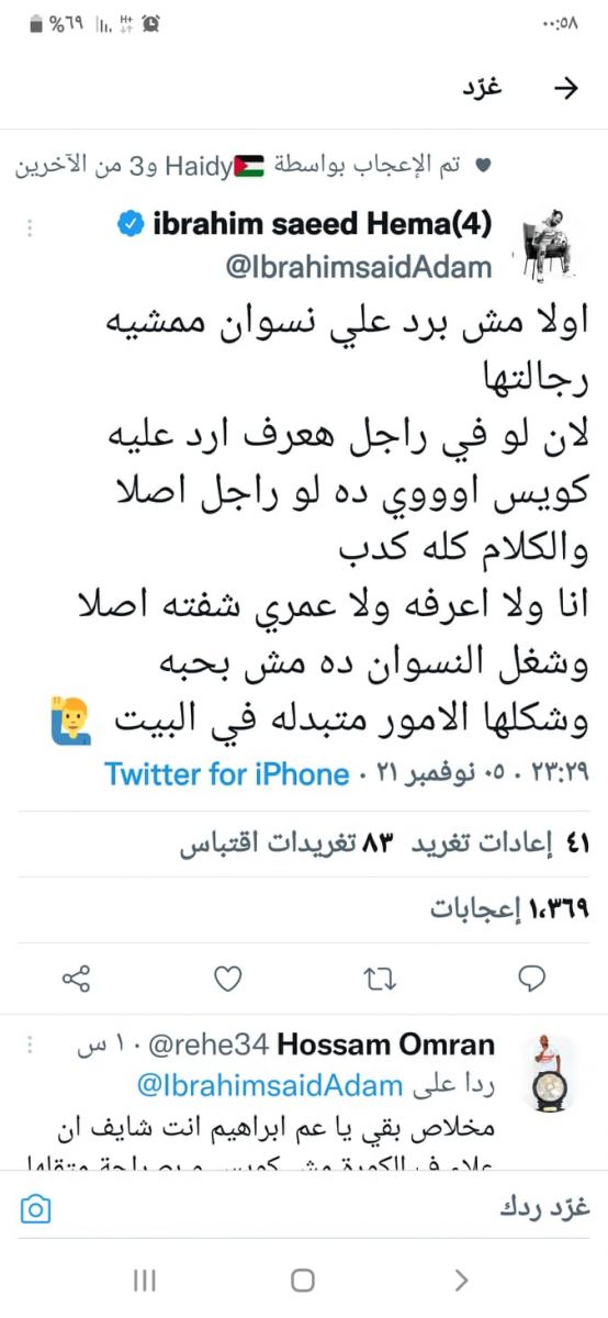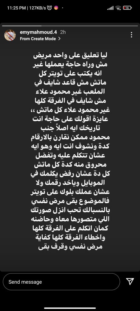 وأضاف " عايزة اقولك على حاجة انت تاريخك اي اصلا جنب محمود ممكن نقارن بالأرقام كده ونشوف انت ايه وهو ايه عشان تتكلم عليه وتفضل محروق منه كده كل ماتش كل ده عشان رفض يكلمك في الموبايل وياخد رقمك ولا عشان عملك بلوك على تويتر فالموضوع بقى مرض نفسي بالنسبالك ".