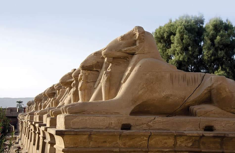 يقع على جانبي الطريق تماثيل الكباش.