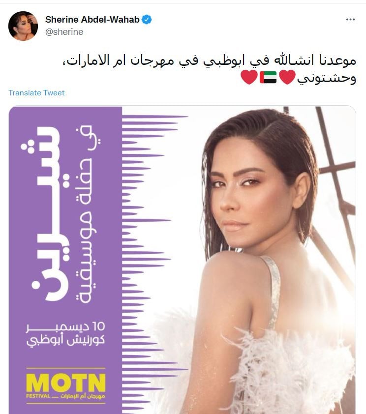 ونشرت شيرين في أول منشور لها بعد تلك الأنباء تكشف فيه عن مفاجأة فنية جديدة تنتظر جمهورها في الإمارات، معلنة أنها ستحيي حفلاً في أبو ظبي يوم الـ 10 من ديسمبر المقبل.