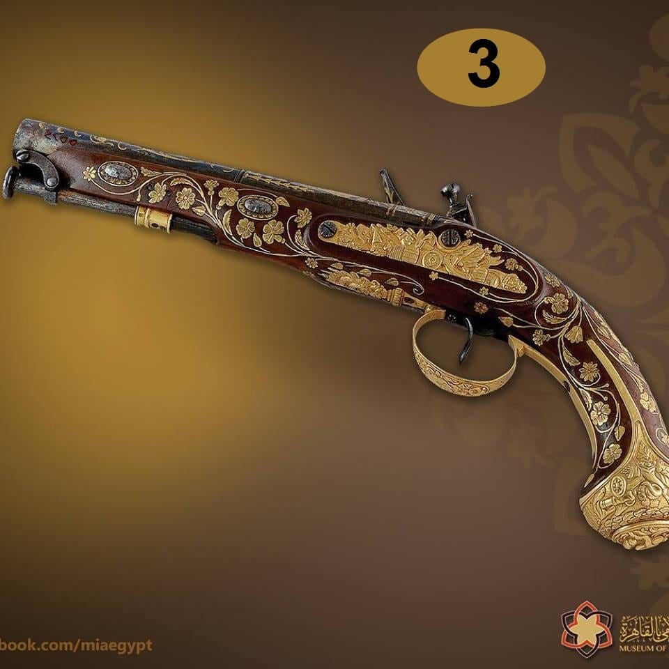 كما يعرض خوذة من العصر المملوك، وطبنجة مذهبة من عصر أسرة محمد علي، و ورقة من مخطوط يُنسب إلى المدرسة التيمورية في التصوير حيث تتضح سمات المدرسة في بدايتها، ويظهر مع الكتابات الفارسية معركة بين عدد من الجنود بالزي العسكري يمتطون الجياد ويحملون السيوف. متحف الاسكندرية القومي: يعرض ثلاثة قطع عبارة عن طبنجة مكفته بالذهب، من مقتنيات أسرة محمد علي، ذات مقبض من الخشب عليها زخارف نباتية متشابكة وفي نهاية المقبض جامه بداخلها رأس أسد بارز، والماسورة مصنوعة من الصلب عليها زخارف نباتية يتخللها بحور كتابية بالخط الفارسي. وحربة مزودة بعمود من الخشب مركب به جزء معدني يمثل نصل الحربة مزين بزخارف نباتية متداخلة ومتشابكة عليها كتابات بالخط النسخ نصها "ياحنان يامنان" مكررة وجميع الزخارف مكفته بالذهب. وخوذة نصف دائري من العصر الإسلامي، مزودة بشبكة من