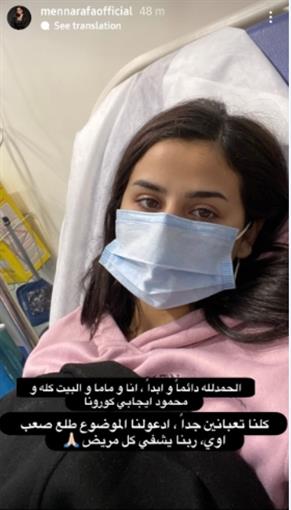 وقالت: "الحمد لله دائما وأبدا أنا وماما والبيت كله ومحمود إيجابي كورونا، كلنا تعبانين جدا، إدعولنا الموضوع طلع صعب أوي، ربنا يشفي كل مريض.