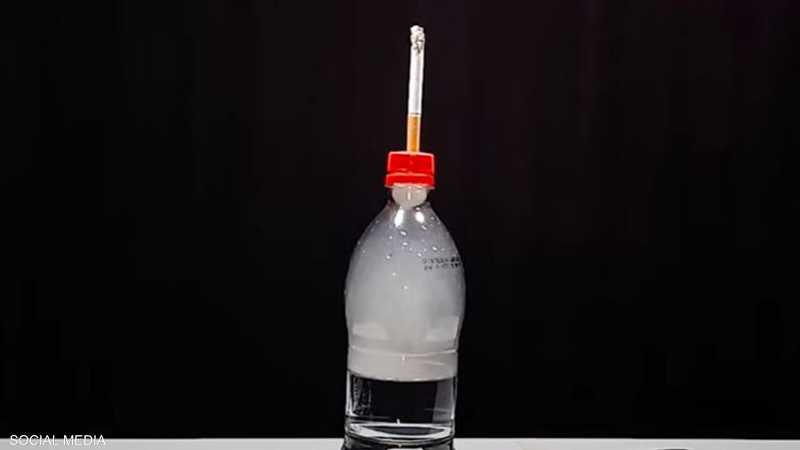 وفي التجربة، جلب أحمد زجاجة بلاستيكية فيها مياه، ووضع قطعة قطنية في عنقها، ثم جلب غطاءً وثقبه ، والخطوة التالية كانت تثبيت سجارة في الزجاجة، ثم أشعل السيجارة، وكرر التجربة 10 مرات.