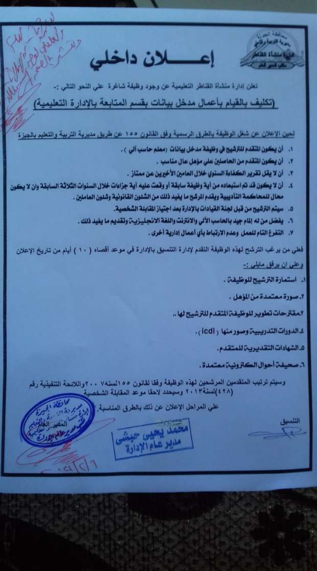 أعلنت إدارة منشأة القناطر التعليمية، عن وظيفة شاغرة وهي القيام بأعمال مدخل بيانات " معلم حاسب آلي"، بقسم المتابعة، إلى أن يتم الإعلان عن شغل الوظيفة بالطرق الرسمية، وفق القانون 155، عن طريق مديرية التربية والتعليم، والتعليم الفني في محافظة الجيزة، على من يرغب في الترشح لهذه الوظيفة التقدم لإدارة التنسيق بالإدارة في موعد أقصاه 10 أيام من تاريخ الإعلان اليوم .