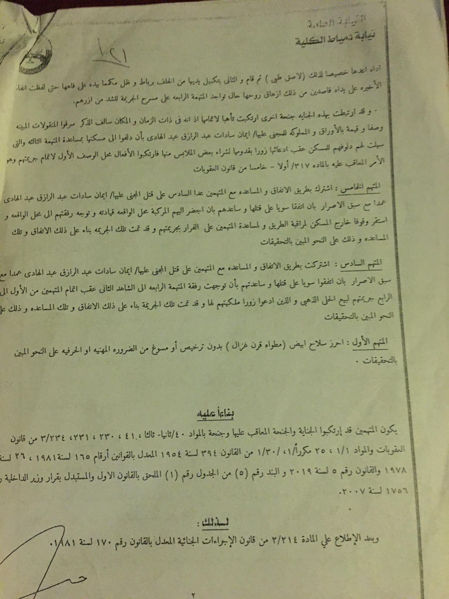 ايمان محمد وياسمين عبد العزيز بمدينة شربين التابعة لمحافظة الدقهلية محل اقامة الثانية بعد ان تعرف عليهن وبعمل الأكمنة اللازمة تم ضبط المتهمين الاخرين وفي ذات السياق اكد المستشار احمد مصطفي فعص نائب رئيس لجنة الوفد بمحافظة دمياط ومحامي المجني عليها انةً طالب باحالة اوراق المتهمين الي مفتي الديار المصرية باعدام المتهمين جميعا وذلك لثبوت واقعة القتل العمد والمقارنة بسرقة نص كيلو ذهب الخاص بالمجني عليها خاصة بعد ثبوت واقعة القتل ثبوتًا يقينا وذلك باعتراف المتهمين جميعا بارتكاب الجريمة عن عمد ومع عقد النية والعزم علي ذبح المجني عليها كما هو ثابت بالاوراق حيث ذهبوا الي شقة المجني عليها حاملين الاسلحة البيضاء والاحبال ولصق بلاستيكي كاتم الصوت وقاموا بارتكاب الواقعة واضاف فعص اما بالنسبة لباقي المتهمين وهم ايمان محمد علي محمود وياسمين عبد العزيز السيد المرسي وهم من قاموا باخفاء المسروقات وقاموا ببيعها لتاجر ذهب بمدينة شربين بالدقهلية قرر رئيس المحكمة حجز القضية  لجلسة ٢٠٢٢/٥/٨ للنطق بالحكم