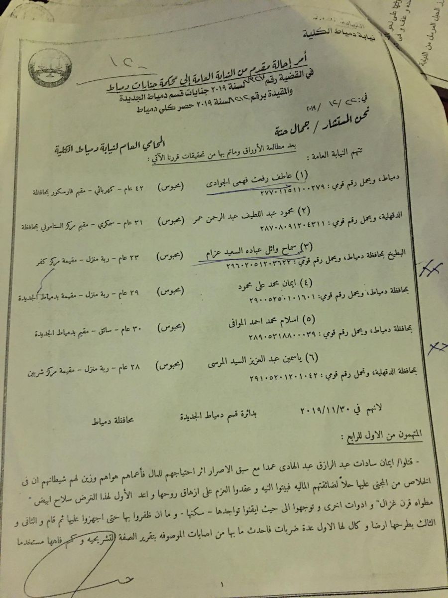 أن وراء ارتكاب الواقعة 6 متهمين وهم عاطف رفعت فهمي الجوادي ٤٣ عاما  كهربائي ومقيم بمدينة فارسكور بدمياط ومحمود عبد اللطيف عبد الرحمن  سمكري سيارات ٣٤ عاما ومقيم بقرية ستمون بمركز بلقاس بمحافظة الدقهلية وسماح وائل  عبادة السعيد عزام ربة منزل ٢٢عاما بمركز كفر البطيخ بدمياط، وإيمان محمد محمد علي محمود ٢٩ عاما ربة منزل ومقيمة بدمياط الجديدة وإسلام محمد احمد الموافي ٣٠عاما  سائق وياسمين عبد العزيز السيد المرسي ٢٨ عاما  ربة منزل ومقيمة بمدينة شربين بمحافظة الدقهلية.