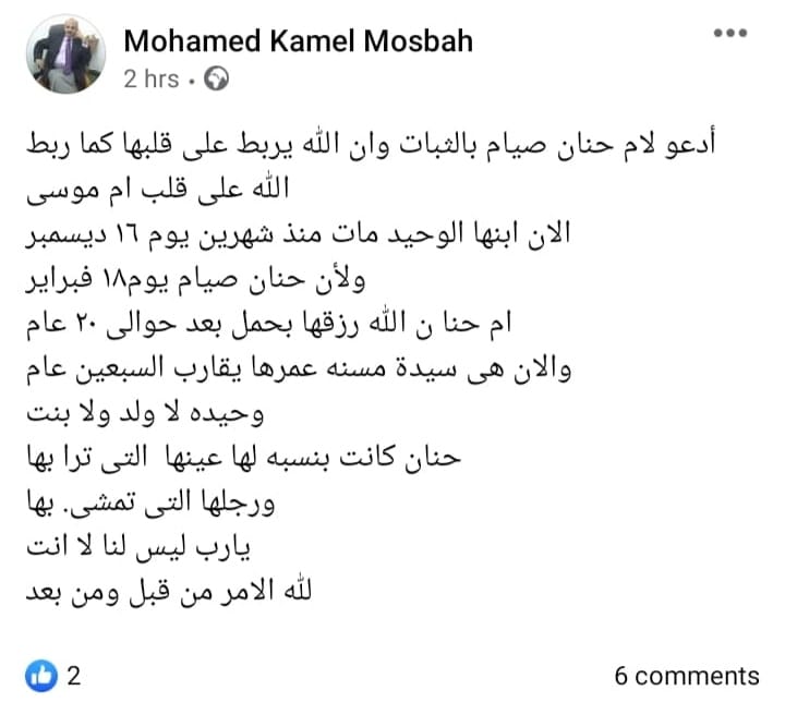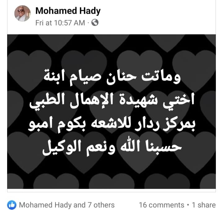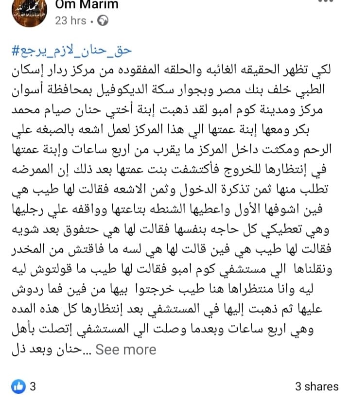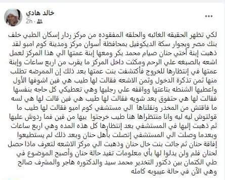 وتابعت:"حنان كانت في حالة جيدة مجرد توجها لمركز الأشعة تخرج جثة هامدة، ورايحة تعمل أشعة يخرجوا بيها على نقَّالة بين الحياة والموت بسبب خطأ طبي، محدش عايز يعترف بيه، مش لاقينله علاج أو زي ما الدكاترة في المستشفى بيقولوا أستنفذوا كل الحلول الطبية الممكنة معاها، وكان الرد مافيش في إيدنا شيء غير إننا ندعي ربنا،  إنها تقوم بالسلامة، تقوم بس عشان أمها اللي لسَّه أبنها متوفي من أقل مش شهرين ومش حِمل تخسر بنتها الوحيدة اللي ساندة عليها".