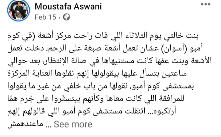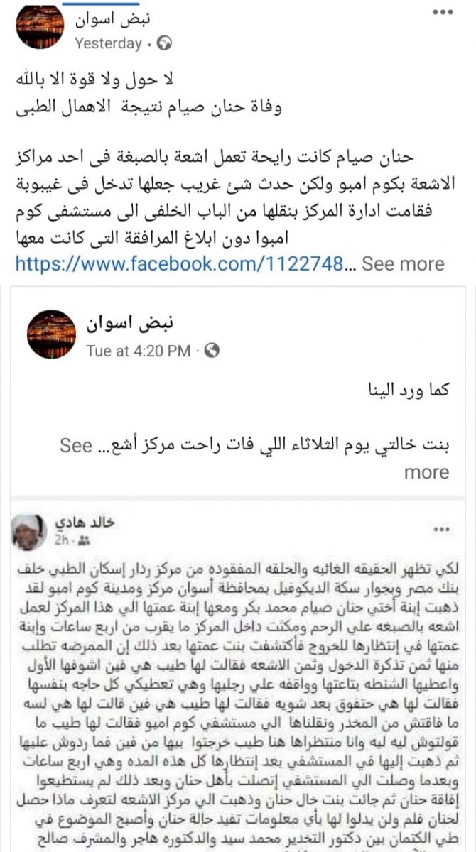 وأضافت:"إنها علمت بنقلها عبر باب خلفي دون أن يتم أخبارها وأن حالتها كانت بصحة جيدة قبل الأشعة، وتم نقلها عبر باب خلفي وكأنهم  بيتستَّروا على جُرم همَّا أرتكبوه، انتقلت الي مستشفى كوم أمبو وكان ردهم بسبب عدم توفير إمكانية لديهم ولا إسعاف لذلك تم نقلها ، ولازم يلحقوا يوصلوا بيها مستشفى أسوان العام".