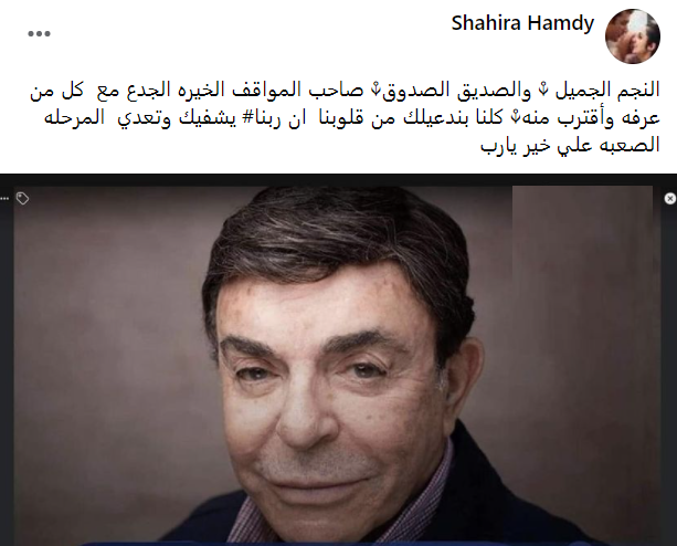 وكتبت شهيرة، عبر صفحتها قائلة: "النجم الجميل والصديق الصدوق صاحب المواقف الخيرة، الجدع مع كل من عرفه واقترب منه، كلنا بندعيلك من قلوبنا إن ربنا يشفيك وتعدي المرحلة الصعبة على خير يا رب".