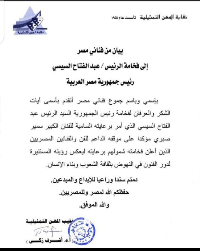 وجاء نص البيان كالآتي: "باسمي وباسم جموع فناني مصر اتقدم باسمى آيات الشكر والعرفان لفخامة رئيس الجمهورية السيد الرئيس عبدالفتاح السيسي الذي أمر برعايته السامية للفنان الكبير سمير صبري".