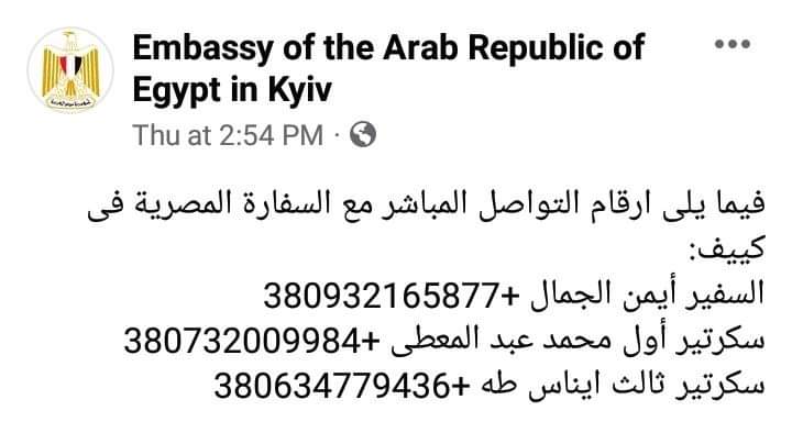 للمصريين في أوكرانيا.. أرقام هامة للتواصل مع المسئولين للمساعدة في العودة لأرض الوطن