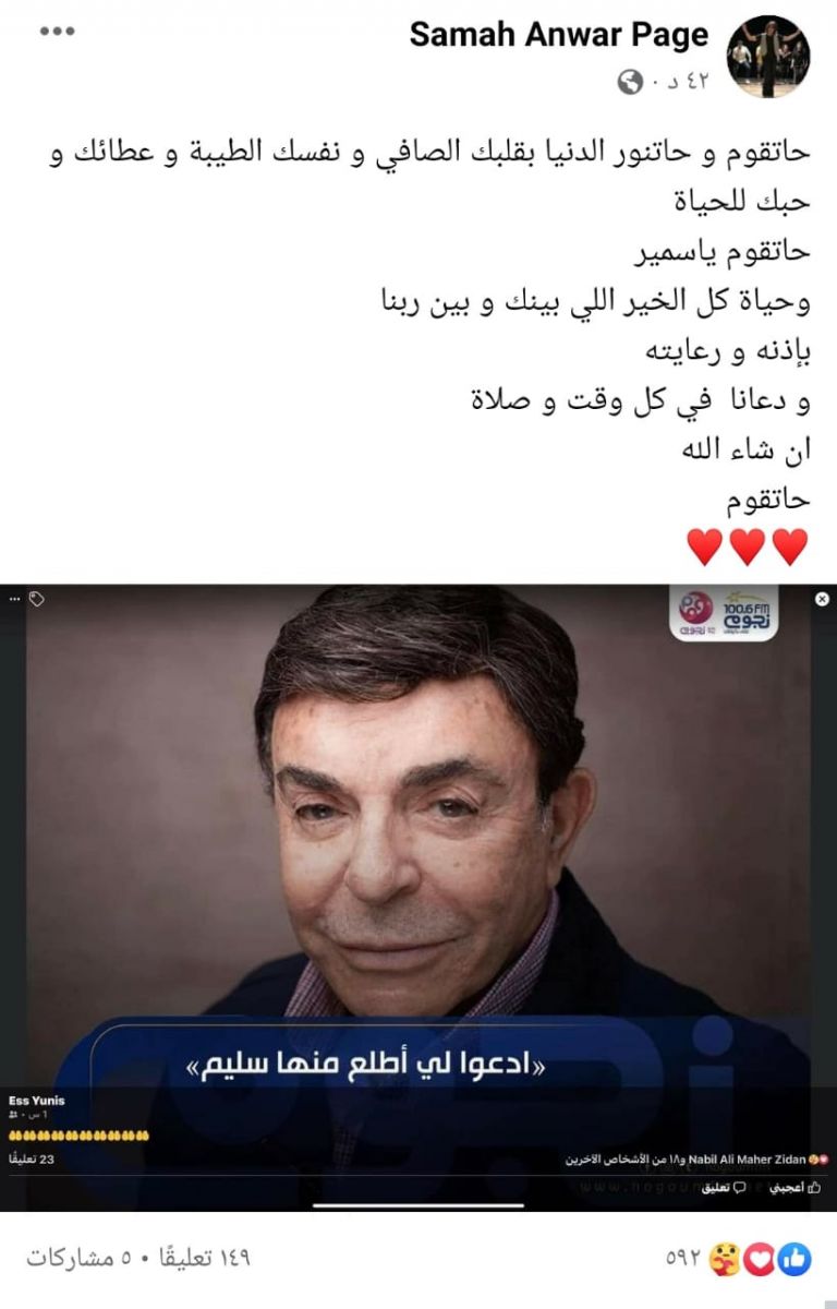 وكتبت "سماح" عبر صفحتها قائلة: "هتقوم وهتنور الدنيا بقلبك الصافي، ونفسك الطيبة، وعطاءك وحبك للحياة، هتقوم يا سمير، وحياة كل الخير اللي بينك وبين ربنا، بإذنه ورعايته ودعائنا في كل وقت وصلاة، إن شاء الله هتقوم.
