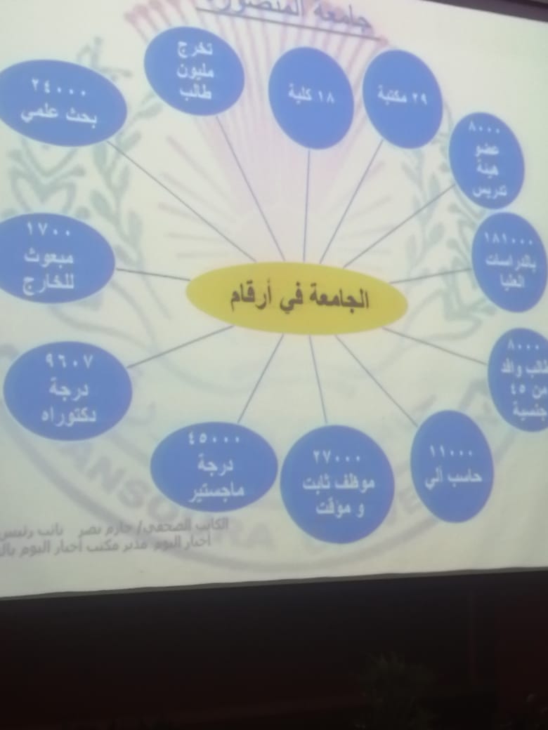 واختتم الكاتب حازم نصر المحاضرة بأرقام تتميز بها جامعة المنصورة؛ إذ تخرج منها مليون طالب وطالبة، وتضم 18 كلية وبها 8000 عضو هيئة تدريس و8000 طالب وافد من 45 جنسية و27000 موظف ثابت ومؤقت وناقشت 45000 ألف رسالة ماجستير و9607 درجة دكتوراة و1700 مبعوث للخارج.